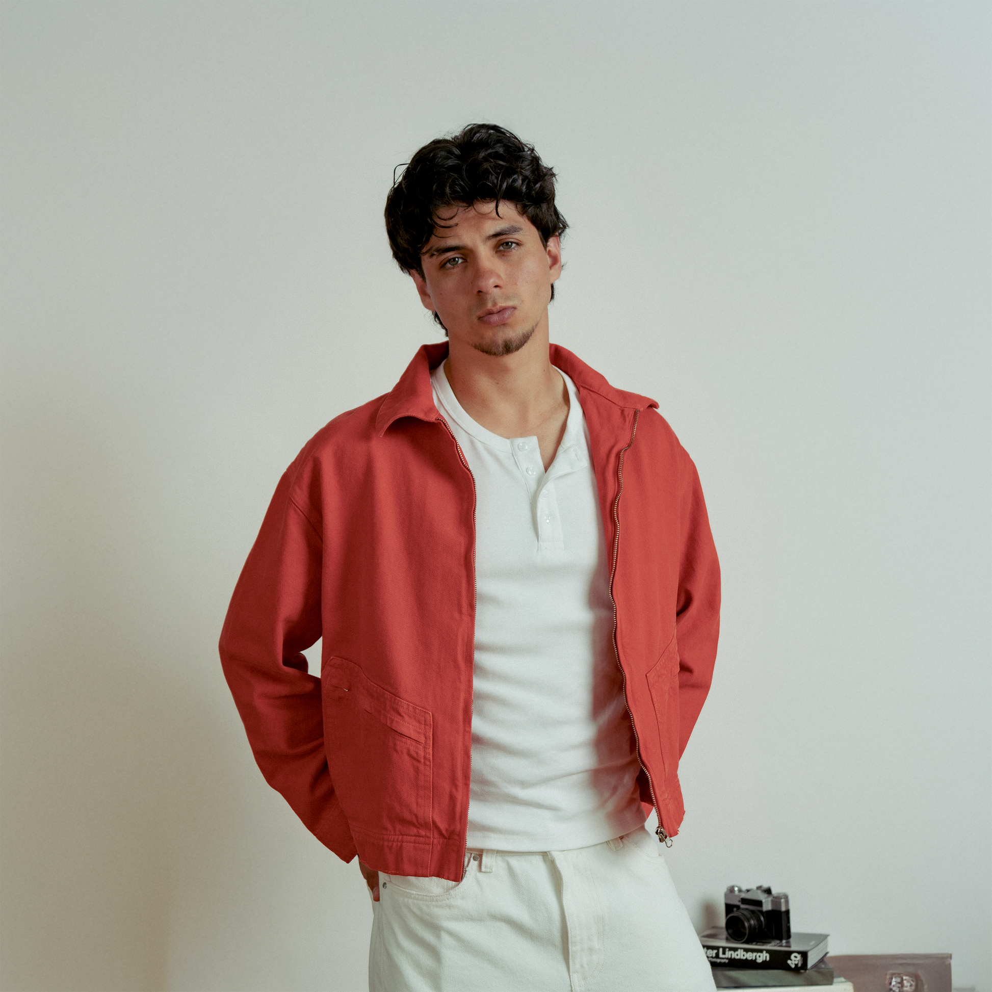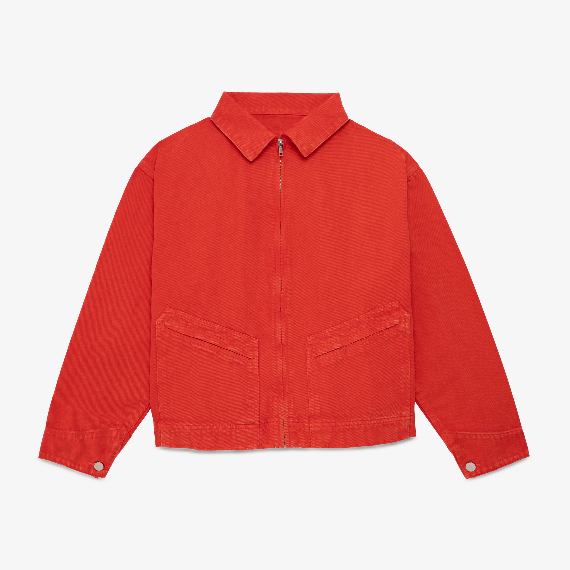 Casaca denim unisex con un fit boxy ligeramente cropped. Elaborada en denim rígido 100% algodón de 12 oz. Teñido azudel de color ladrillo rojizo y efecto de desgaste en las costuras. Cierres al centro y ambos bolsillos delanteros. Detalles en pretina y puños.