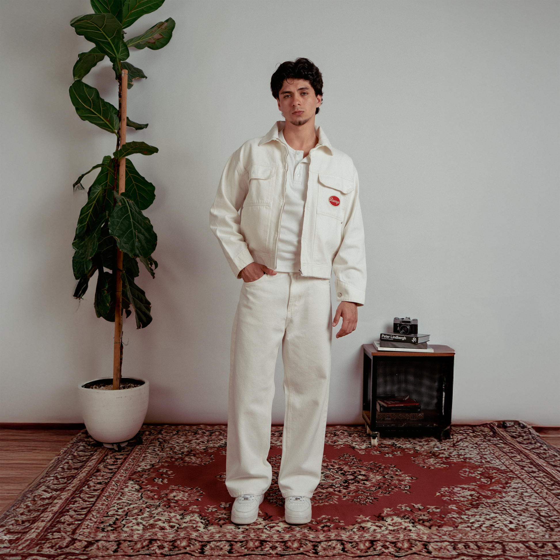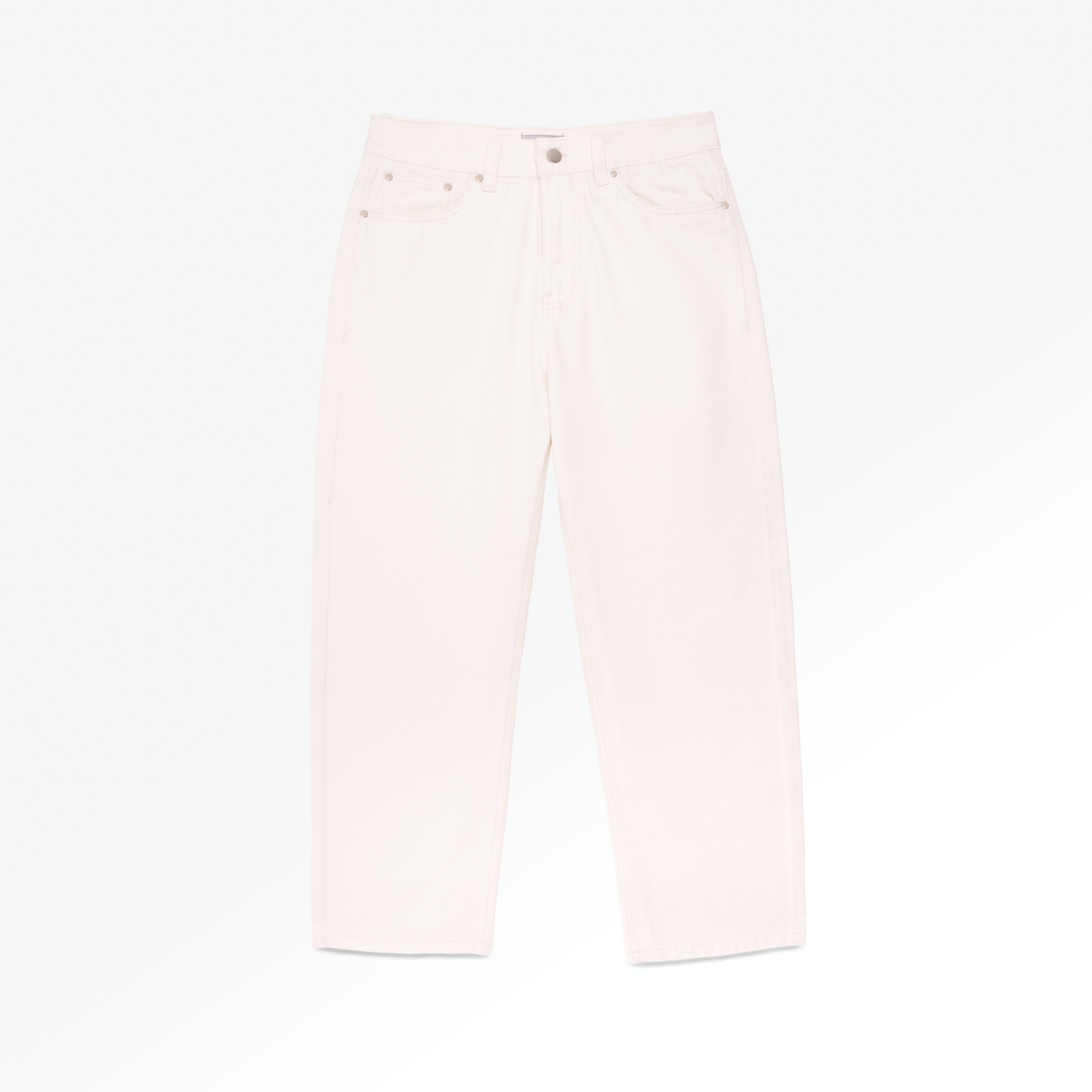 Pantalón unisex con un fit ligeramente baggy. Hecho en denim rígido 100% algodón de 12 oz. Teñido azudel color hueso. 2 bolsillos delanteros y 2 bolsillos traseros con remaches y botón de metal. Detaller de bordado "That's All" en bolsillo posterior.