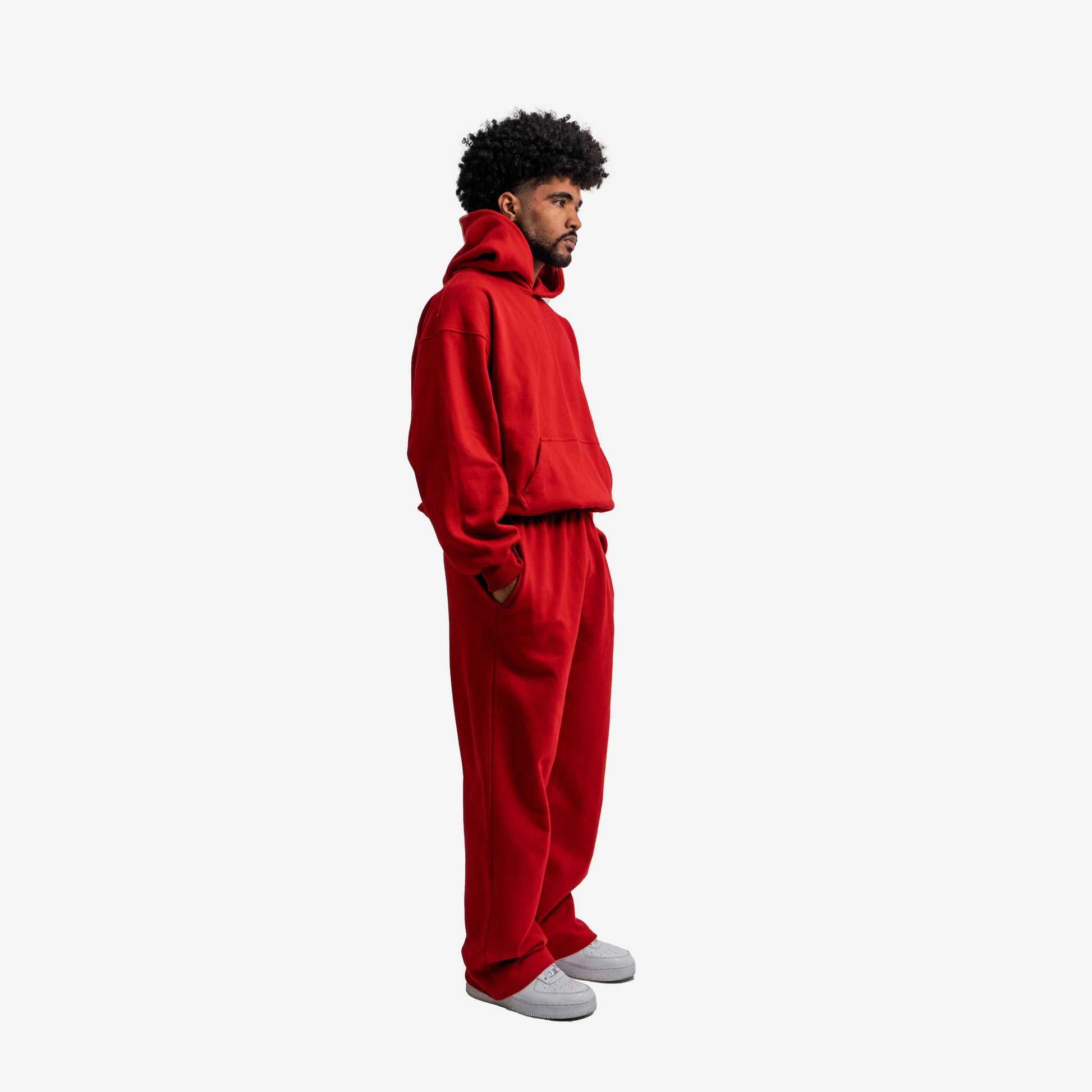 Sweatpant unisex de color rojo con un fit baggy. Hecho de 100% algodón con un gramaje de 325 gr/m2. Cuenta con elástico en la cintura adaptable a cualquier tipo de cuerpo. Bolsillos delanteros y un bolsillo en la parte trasera con vista y cierre.