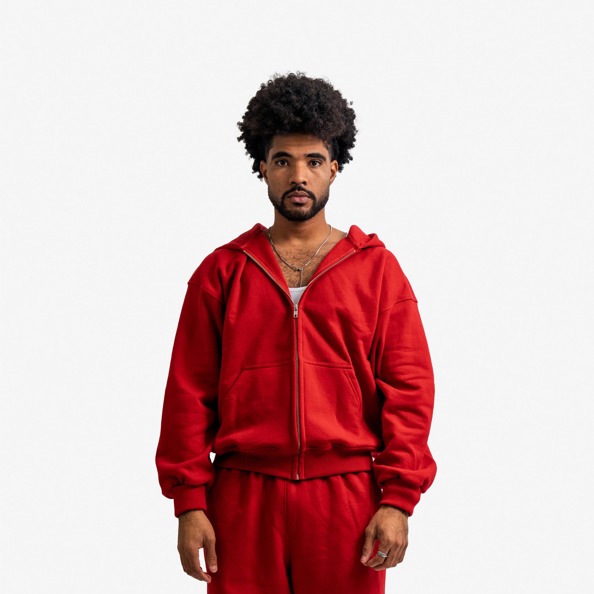 Zip hoodie unisex de color rojo con un fit boxy. Hecho de 100% algodón con un gramaje de 325 gr/m2. Cuenta con capucha y puños acanalados. Cierre de metal niquelado marca YKK. Bolsillo tipo canguro en la parte delantera.